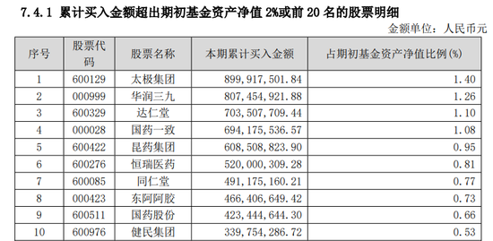 这个持仓的变化从上半年的累计买入情况也能发现,太极集团、达仁堂等均是重点买入的个股,且上半年整体持仓偏向于在中药板块的调整。