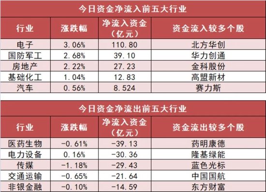申万一级行业中,11个行业实现资金净流入,其中电子行业净流入110.8亿元居首。
