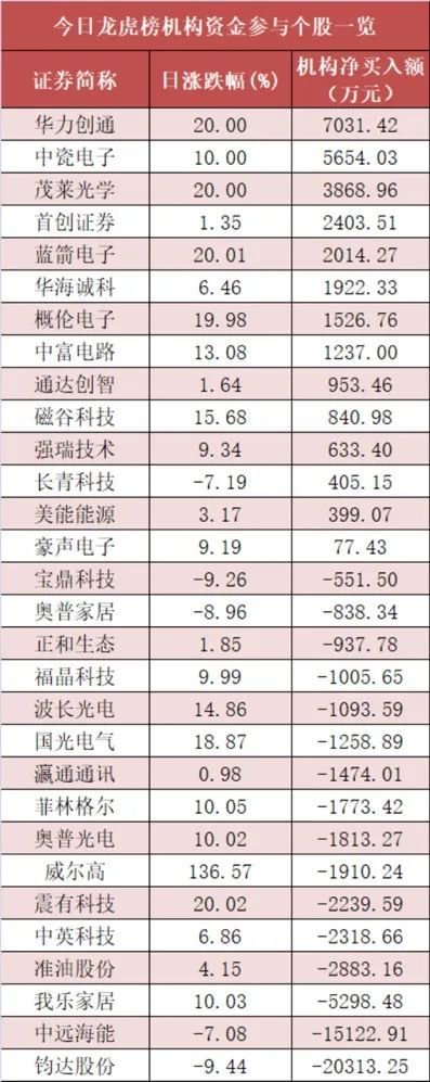 盘后龙虎榜数据显示,机构现身30股,其中华力创通等14股现机构资金净买入,钧达股份等16股呈现机构资金净卖出。