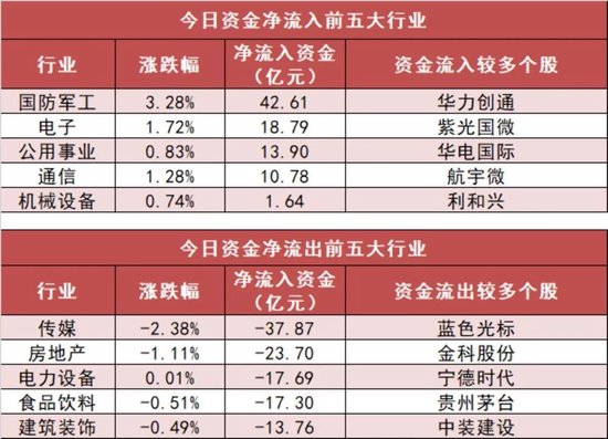 申万一级行业中,6个行业实现资金净流入,其中国防军工行业净流入42.61亿元居首。