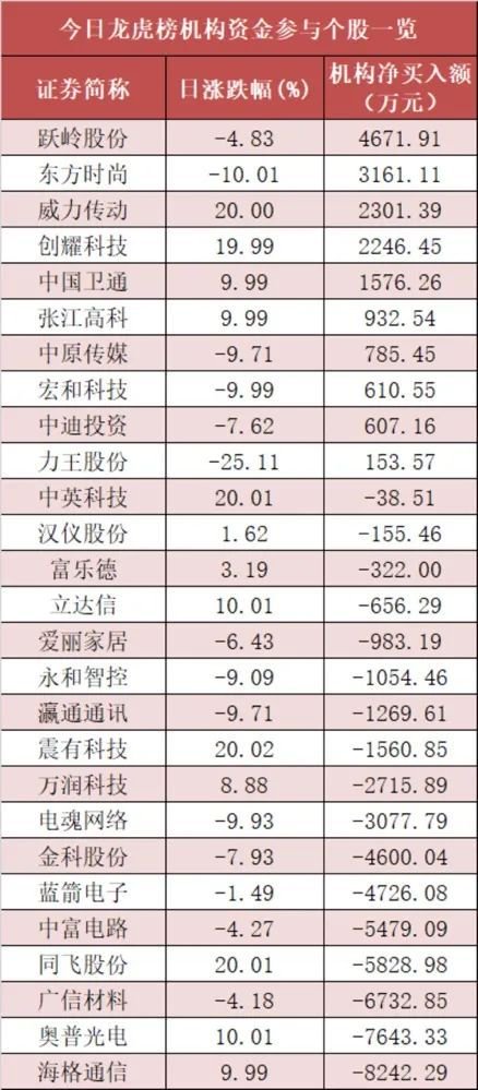 盘后龙虎榜数据显示,机构现身27股,其中跃岭股份等10股现机构资金净买入,海格通信等17股呈现机构资金净卖出。