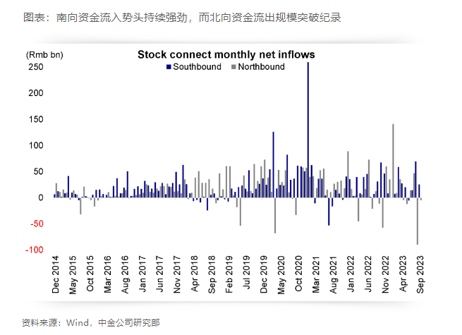 政策有所保留叠加市场见底需要时间,都是拖累近期海外资金依然流出以及人民币走弱的可能原因。但有趣的是,南向资金近期却保持非常强劲的流入势头。在进一步对南向资金具体流向情况分析后,中金发现近期南向资金的大举流入是在情理之中的,主要因素包括: