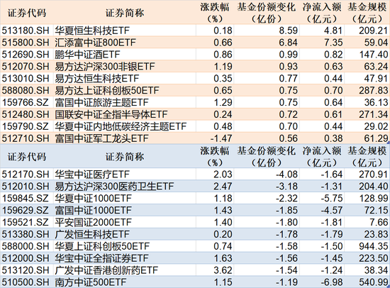 相反,昨日份额减少最多的三只ETF是:华宝中证医疗ETF,上涨了2.03%,但基金份额减少了4.08亿份,净流出额为1.64亿元。其次是易方达沪深300医药卫生ETF,上涨了2.47%,但基金份额减少了3.18亿份,净流出额为1.31亿元。第三位是华夏中证1000ETF,上涨了1.18%,但基金份额减少了2.32亿份,净流出额为5.75亿元。