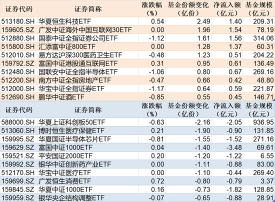 相反,份额减少最多的三只ETF分别是:华夏上证科创板50ETF,下跌了0.63%,基金份额减少了2.16亿份,净流出额为2.05亿元。其次是博时恒生医疗保健ETF,上涨了0.21%,但基金份额减少了1.90亿份,净流出额为0.90亿元。第三位是华夏国证半导体芯片ETF,下跌了0.81%,基金份额减少了1.55亿份,净流出额为1.52亿元。