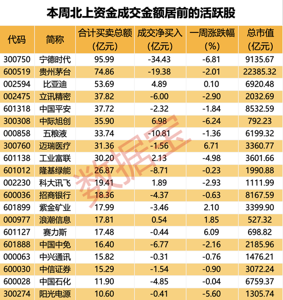 数据宝统计显示,本周共有40股登上北上资金成交活跃榜;所属行业来看,电气设备、食品饮料股本周成交活跃,合计买卖总额在100亿元以上。通信行业个股总体获净买入超5亿元,电气设备、食品饮料行业个股净卖出居前。