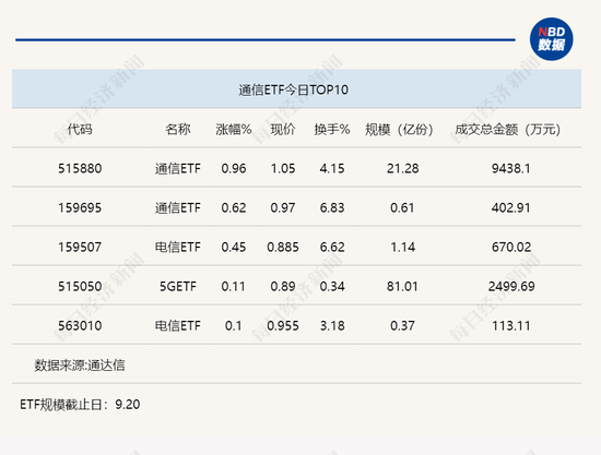 点评:今日上午表现最佳的通信ETF(515880),其规模也达到21.28亿份,半日成交8438.1万元,接近亿元成交也是整个通信板块ETF交投最活跃的品种。该ETF追踪的指数是中证全指通信设备指数 (931160)。