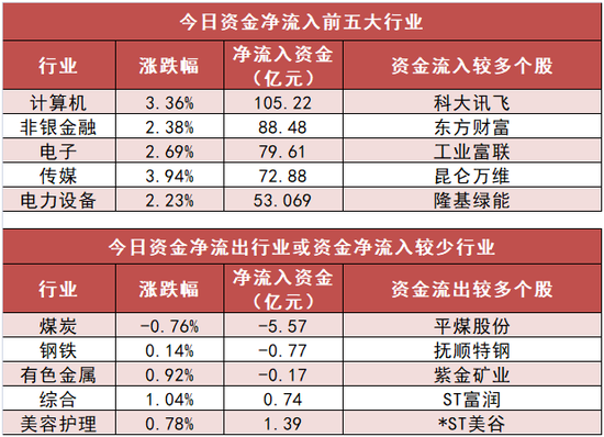 申万一级行业中,28个行业实现资金净流入,其中计算机行业净流入105.22亿元居首。
