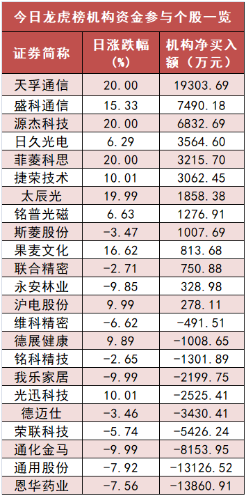 盘后龙虎榜数据显示,机构现身23股,其中天孚通信等13股现机构资金净买入,恩华药业等10股呈现机构资金净卖出。