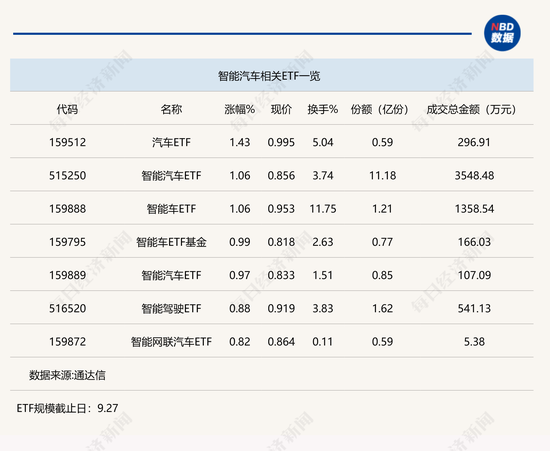 点评:相关智能汽车ETF中,智能汽车ETF(515250)规模最大,其份额达到11.18亿份,该ETF半日成交3548万元;另外,智能车ETF(159888)也受到资金关注,虽然其份额仅1.21亿份,但上午成交金额也超过千万元,达到1359万元,这两只ETF半日涨幅也超过1%,并且追踪的指数均为中证智能汽车主题指数。