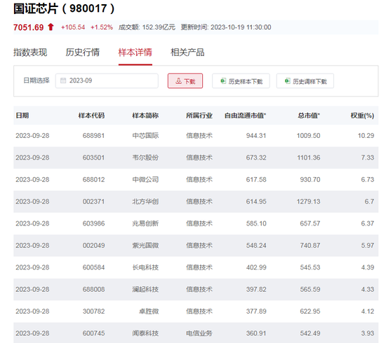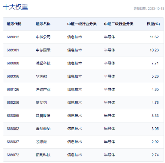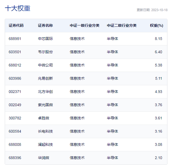 中证全指半导体产品与设备指数以2004年12月31日为基日,以1000点为起使基点,发布日期为2013年7月15日,指数选取了中证全指样本中涉及半导体行业的样本股50只,根据日均成交金额、日均总市值由高到低排名,剔除成交金额排名后 10%、以及累积总市值占比达到98%以后的证券,并且保持剔除后证券数量不少于50只;行业内剩余证券作为相应行业指数的样本。目前,追踪该指数的ETF仅半导体ETF(512480)一家。