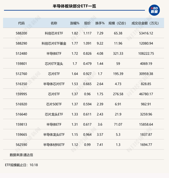 点评:上午表现最好的ETF为科创芯片ETF(588200),其半日涨幅达到1.82%,而科创芯片ETF基金(588290)半日涨幅也达到1.77%。这两只ETF均追踪的是上证科创板芯片指数,其中,科创芯片ETF(588200)规模较大,达到65.38亿份。