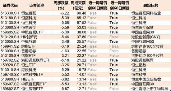 另外,跟踪恒生互联网科技业的恒生互联ETF周成交额最大,达90.48亿元。