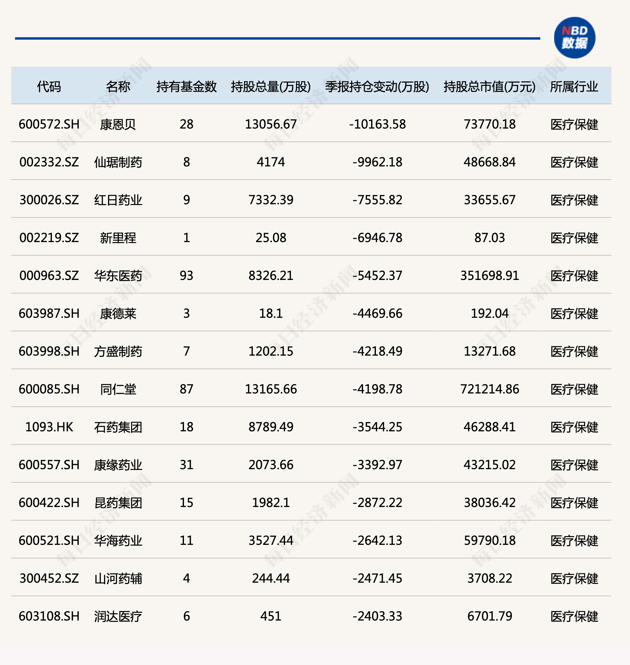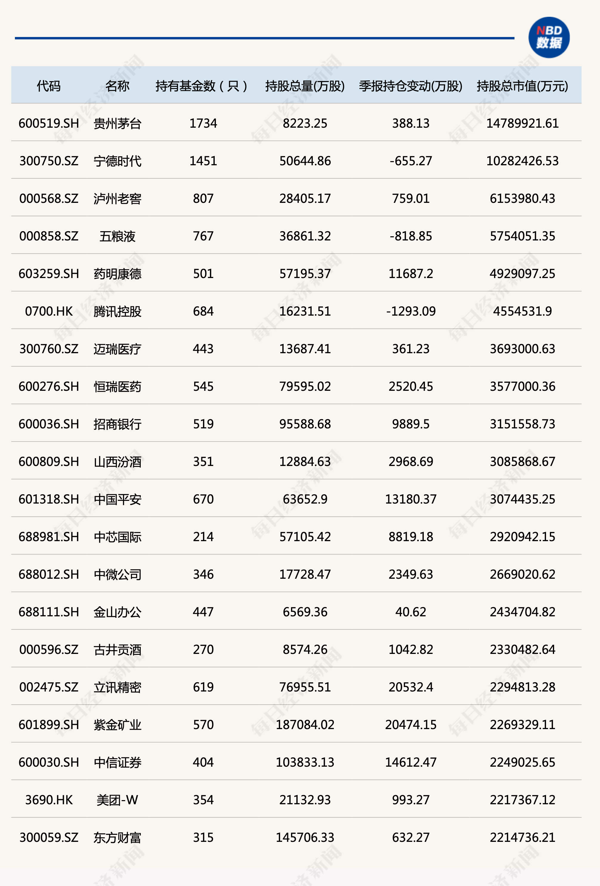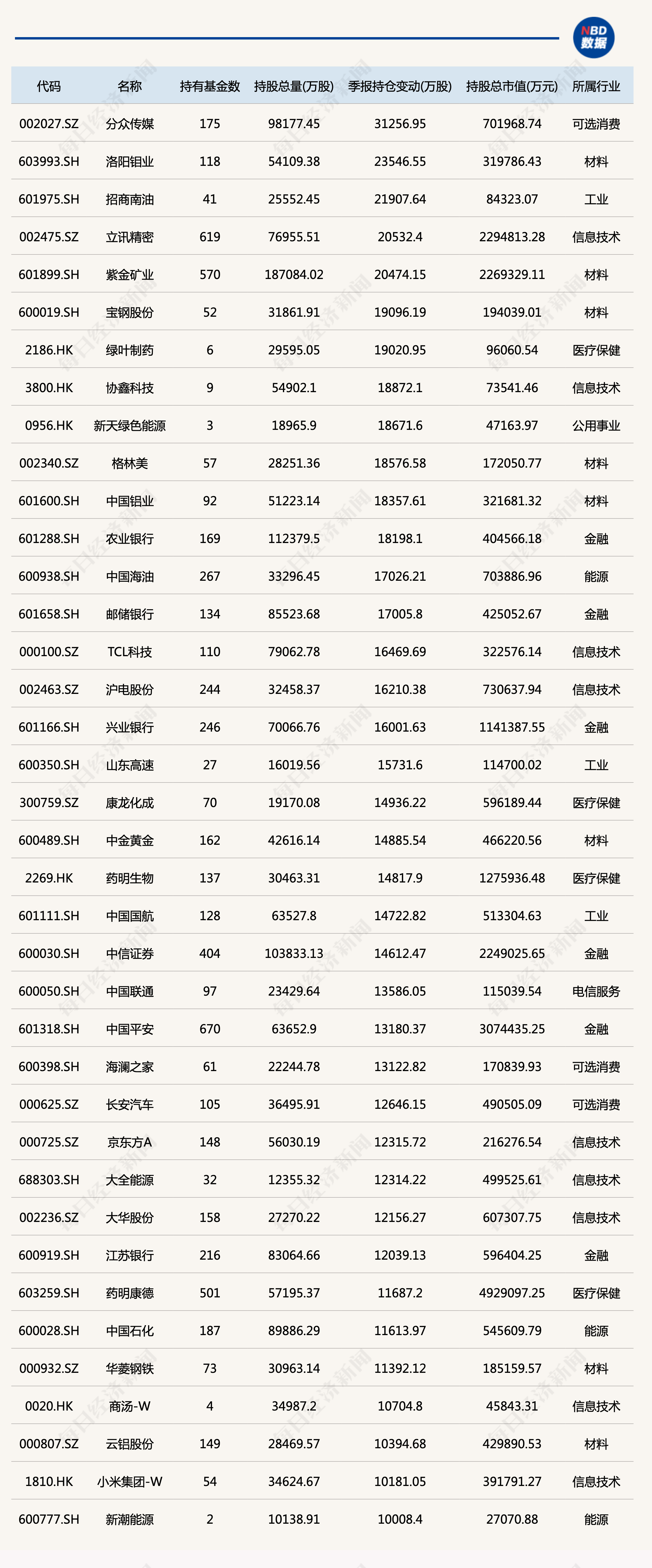 不过需要指出的是,并不是所有个股都被增持,其中也有不少个股被减持,比如有14只个股的持仓减少超过2000万股。