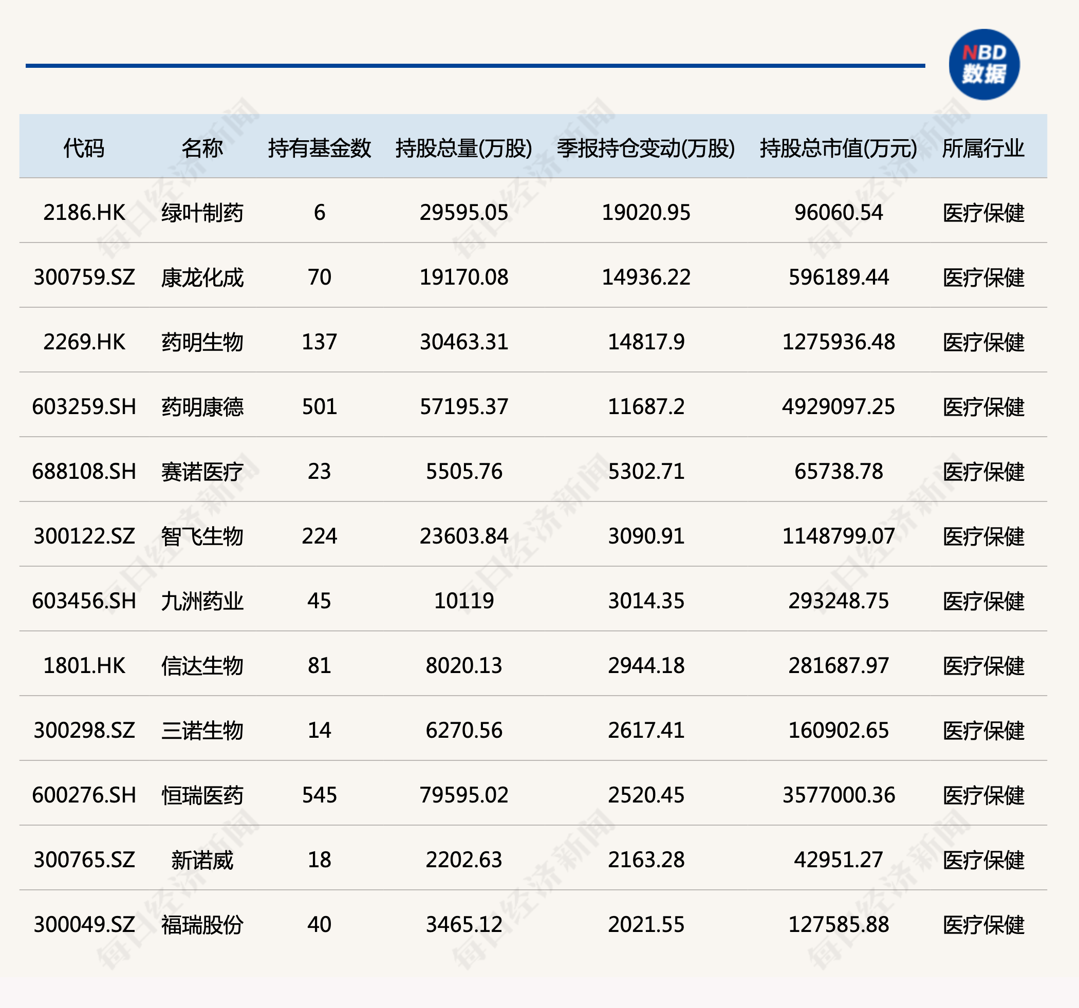 从具体的持仓数据来看,Wind数据显示,在医疗保健行业,三季度共有12只个股的基金持仓增加超过2000万股,确实有不少个股存在比较明显的加仓迹象。