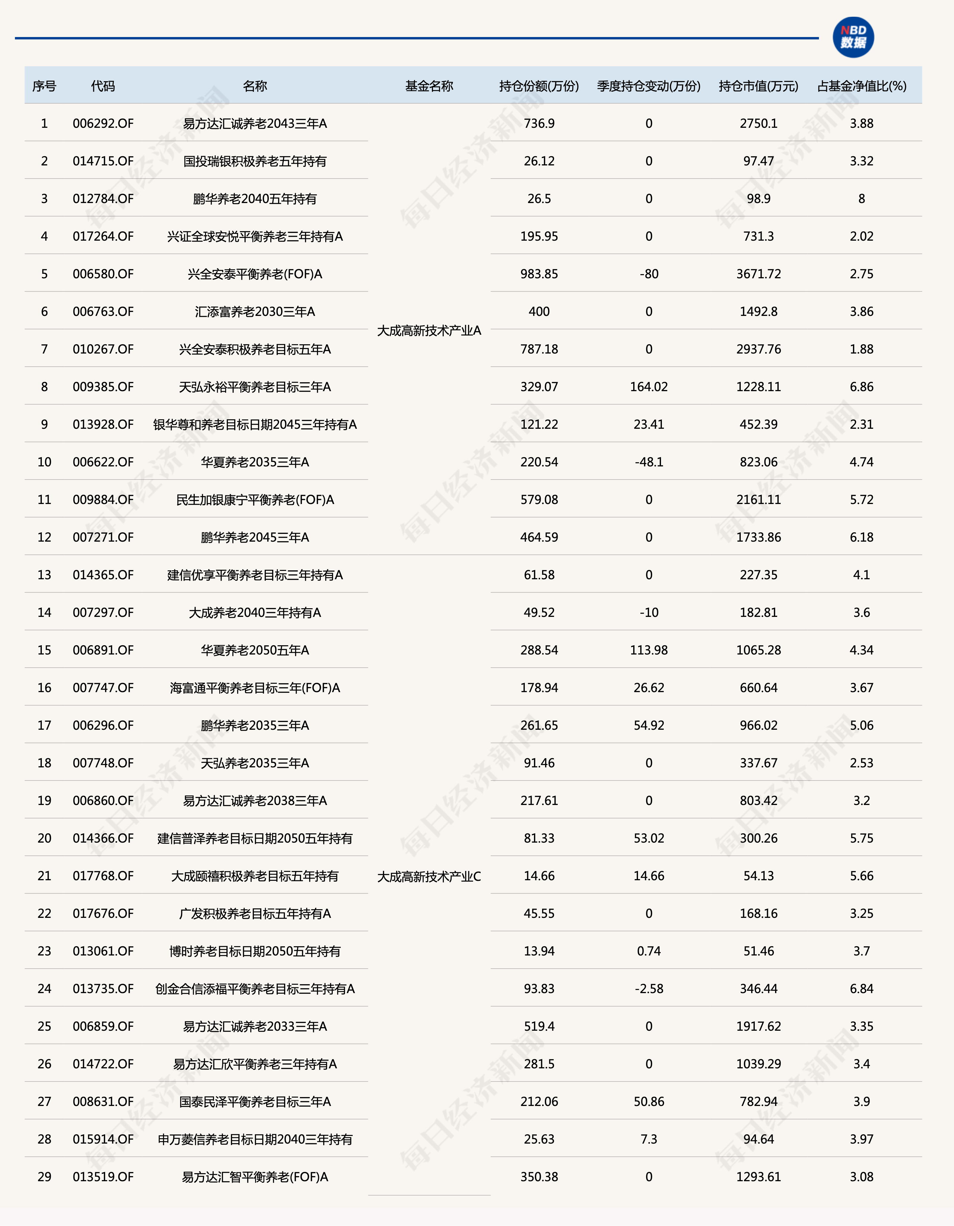比如大成高新技术产业,多达29只养老目标基金重仓: