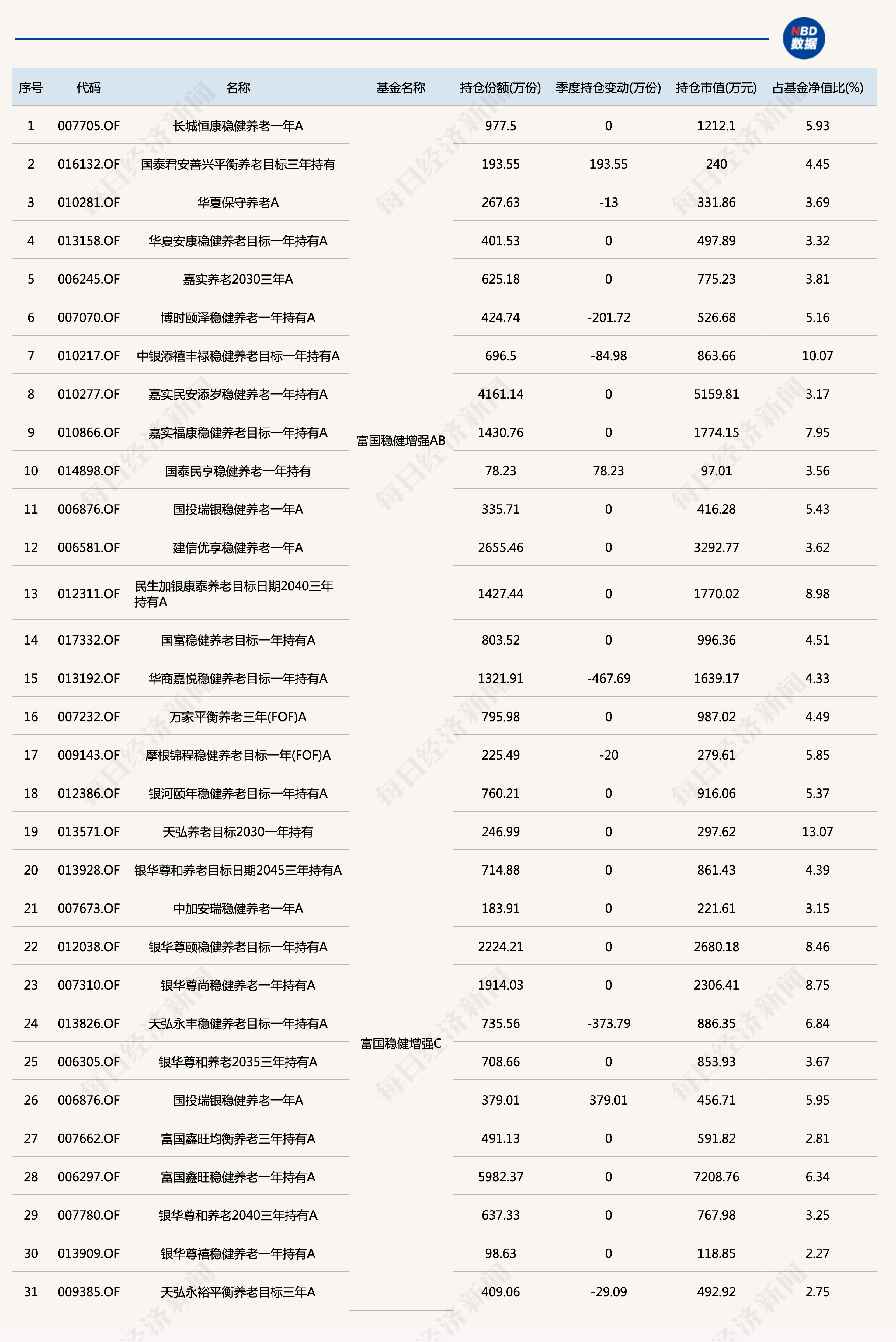 以富国稳健增强为例,31只养老目标基金的重仓情况如下: