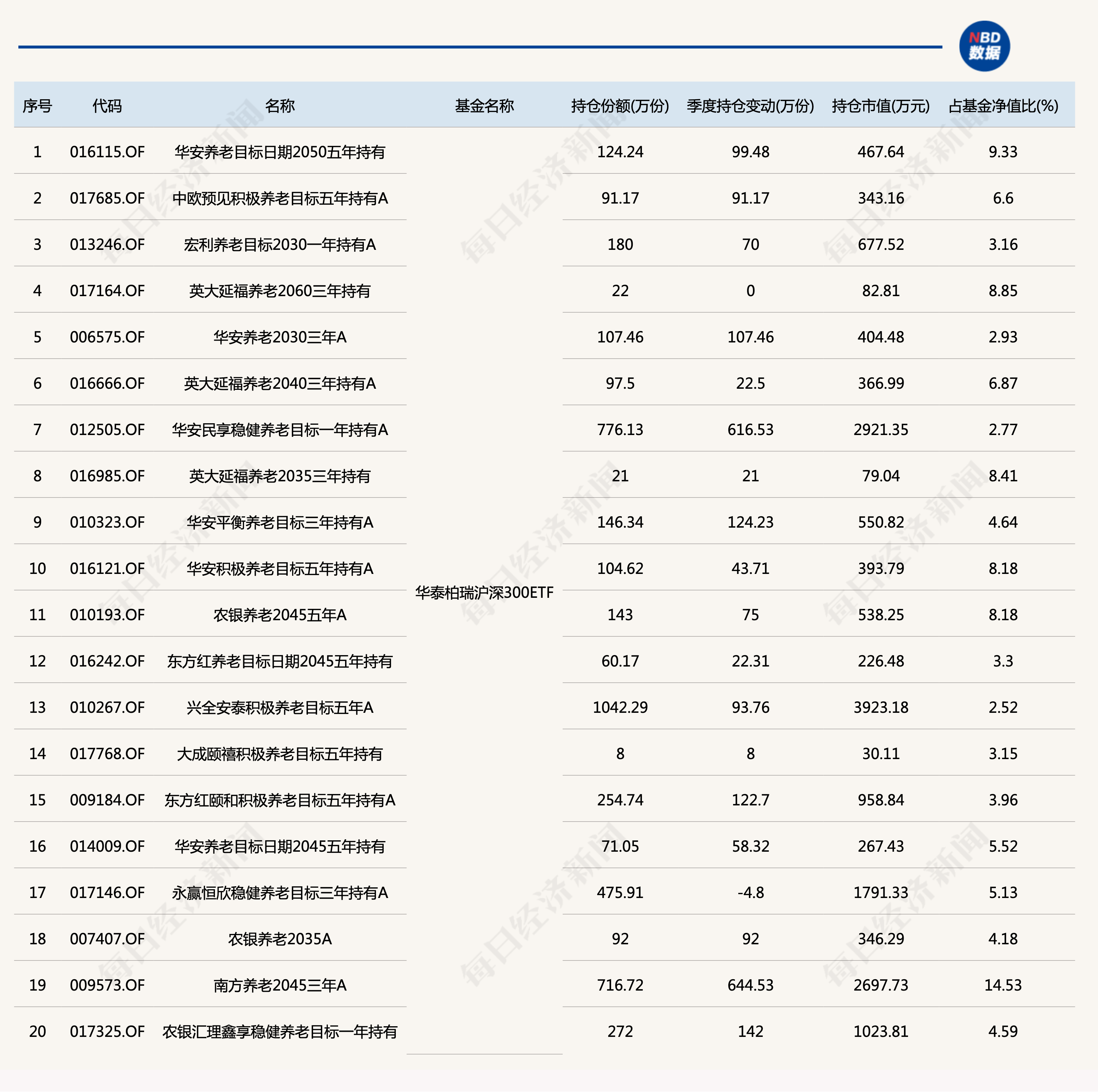还有华泰柏瑞沪深300ETF,也有20只养老目标基金重仓其中: