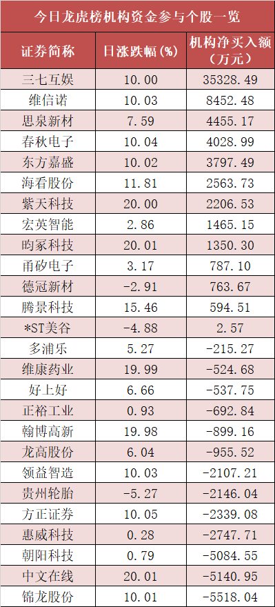 盘后龙虎榜数据显示,机构现身26股,其中三七互娱(维权)等13股呈现机构资金净买入,锦龙股份等13股呈现机构资金净卖出。
