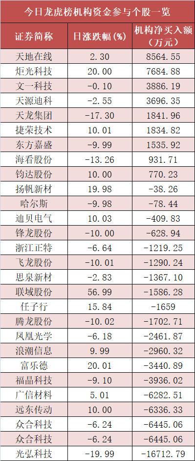 盘后龙虎榜数据显示,机构现身28股,其中天地在线等9股现机构资金净买入,光弘科技等19股呈现机构资金净卖出。