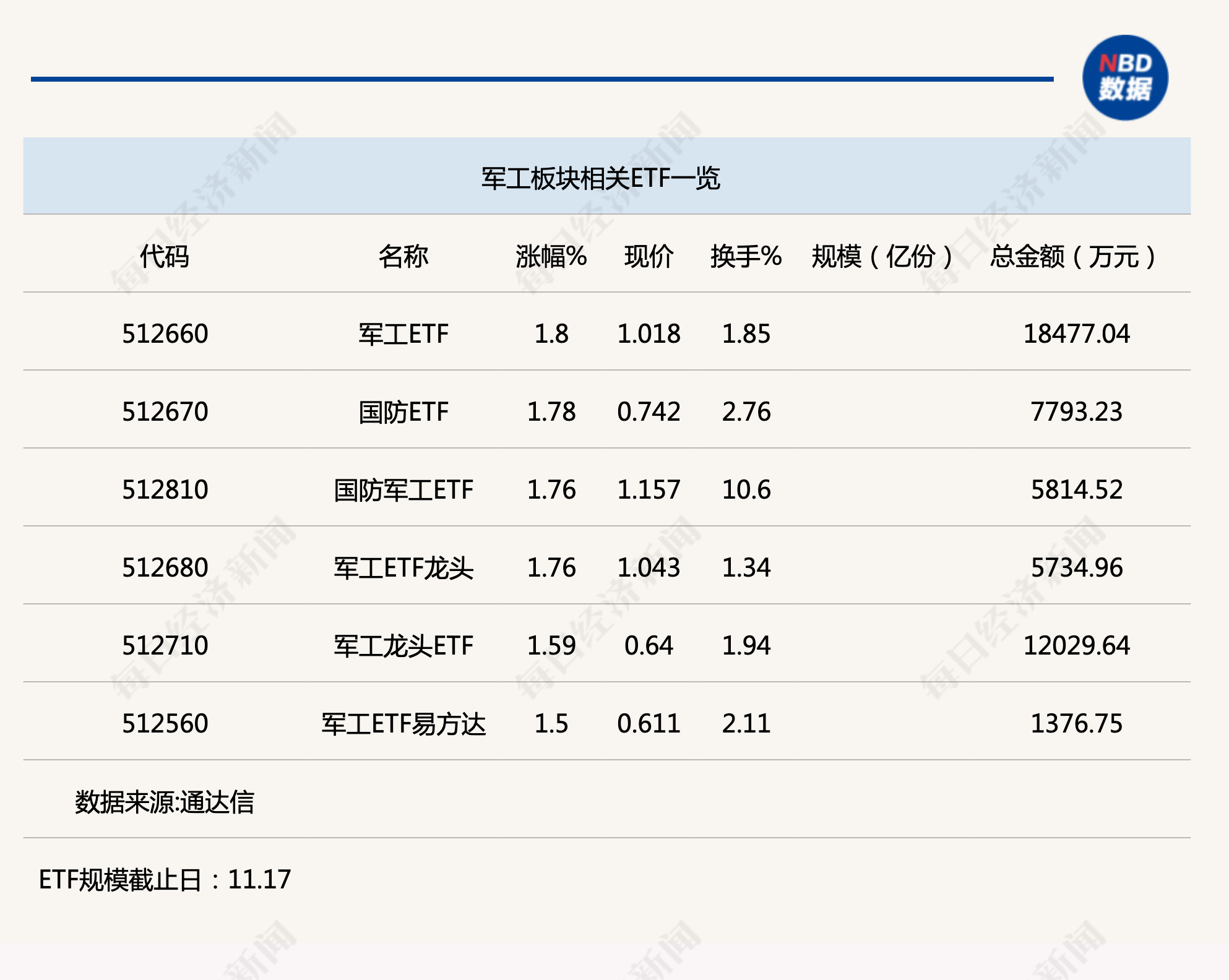 点评:军工ETF(512660)今日上午涨幅达到1.8%,该ETF规模较大,达到99.17亿份,上午成交金额为1.85亿元,成交金额较大,其追踪的是中证军工指数。