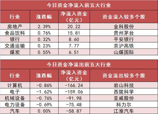 申万一级行业中,9个行业实现资金净流入,其中房地产行业净流入20.22亿元居首。