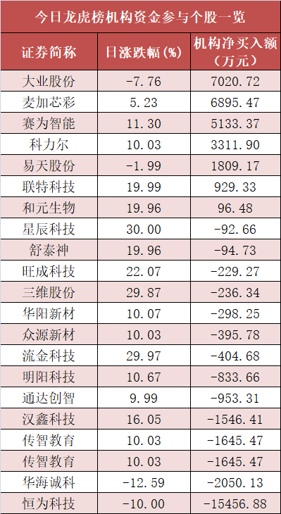 盘后龙虎榜数据显示,机构现身21股,其中大业股份等7股现机构资金净买入,恒为科技等14股呈现机构资金净卖出。