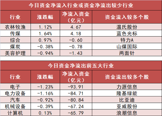 申万一级行业中,电子、电力设备、汽车、机械设备等行业资金净流出规模居前,其中电子行业净流出93.91亿元居首。