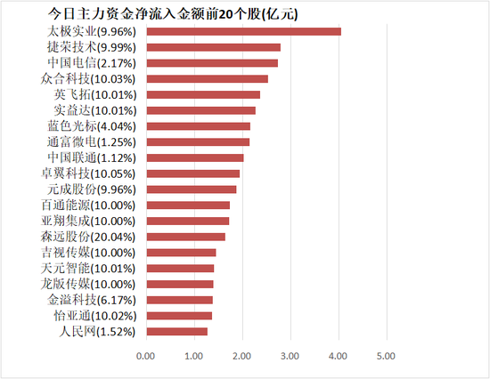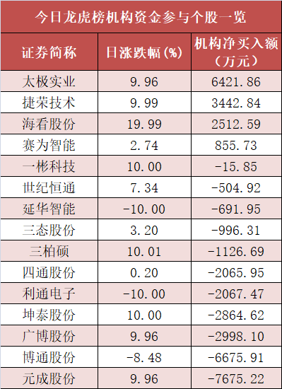 盘后龙虎榜数据显示,机构现身15股,其中太极实业等4股现机构资金净买入,元成股份等11股呈现机构资金净卖出。