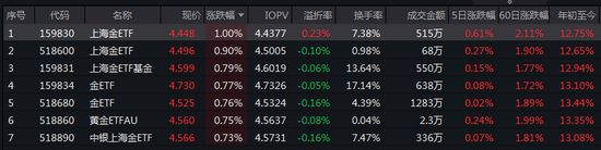点评:目前黄金ETF中,规模最大的为黄金ETF(518880),该ETF规模达到26.73亿份,半日成交金额达到3.05亿元,其追踪的是国内黄金现货价格收益率,这也是目前黄金ETF中交投最活跃的ETF。