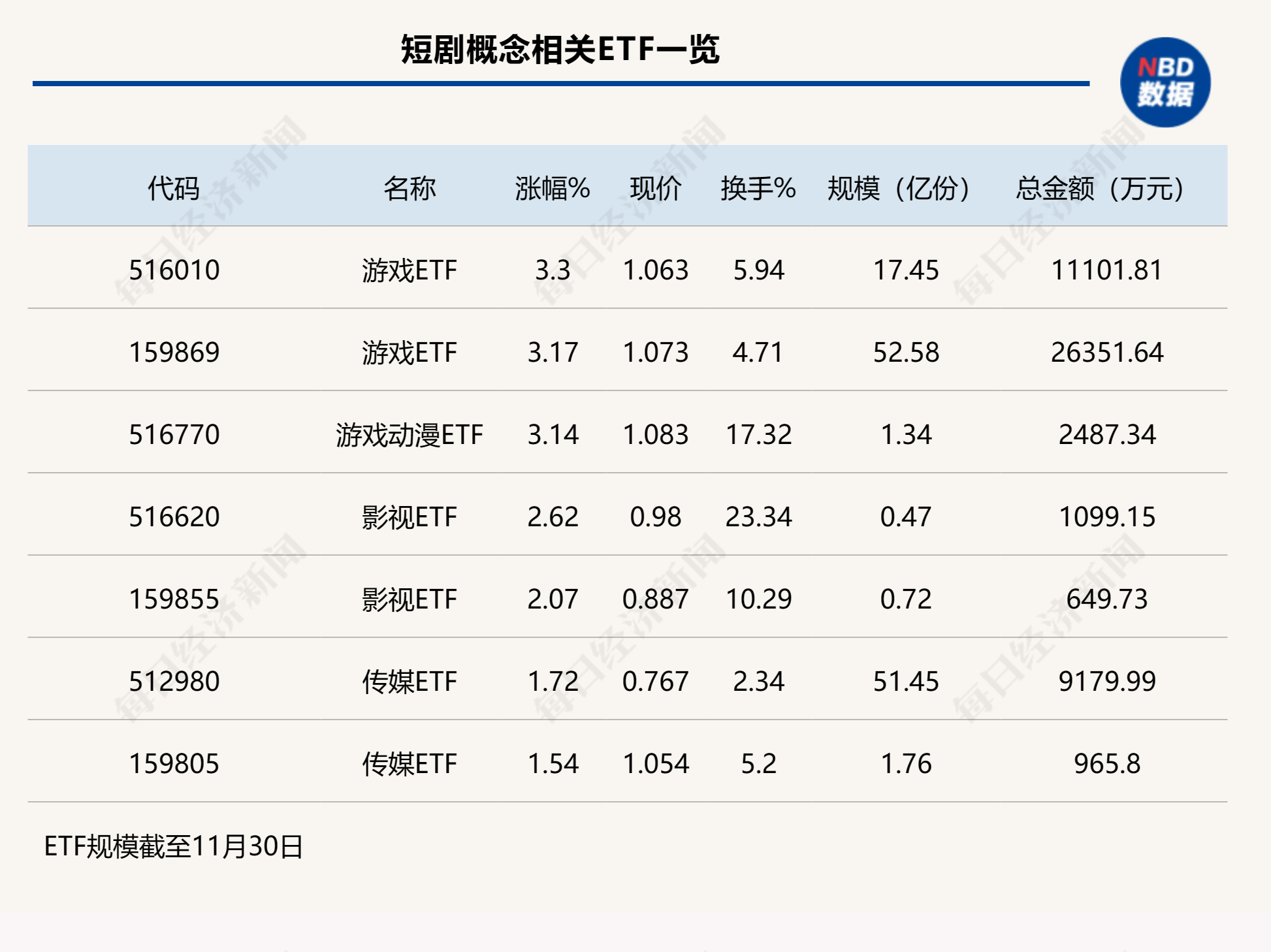 在调整数日后,短剧概念今日重新活跃,短剧产业“三驾马车”游戏、影视以及传媒纷纷大涨,其中,游戏ETF表现最为抢眼,三只ETF涨幅均超3%,游戏ETF(159869)半日成交更是高达2.64亿元。