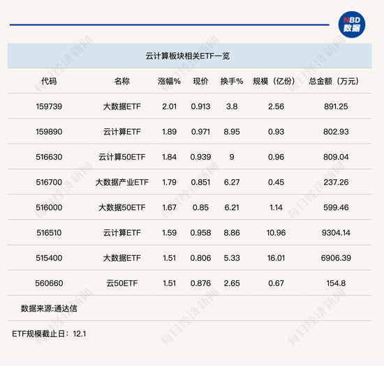 点评:云计算相关概念ETF还包含大数据ETF。其中,大数据ETF(515400)规模较大,达到16.01亿份,其半日涨幅为1.51%,半日成交也达到了6906.39万元,该ETF追踪的是中证大数据产业指数。