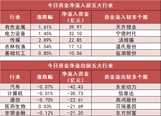 申万一级行业中,10个行业实现资金净流入,其中有色金属行业净流入39.97亿元居首。