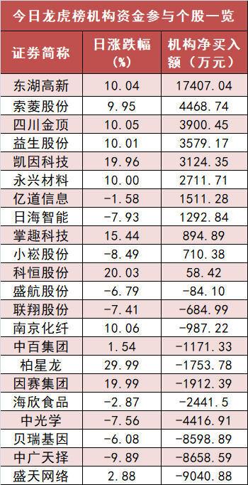 盘后龙虎榜数据显示,机构现身22股,其中东湖高新等11股呈现机构资金净买入,盛天网络等11股呈现机构资金净卖出。