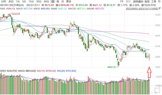 12月11日,万得全A小幅反弹0.88%,成交额为9227亿元,较前一交易日略有缩量,但仍属于近期较高成交量。11日A股早盘低开后快速下挫,盘中跌幅一度超过1.2%,随后企稳反弹。从技术指标上看,放量反弹,收盘指数成功站上5日均线,市场企稳迹象明显,短线或有望乘胜追击。