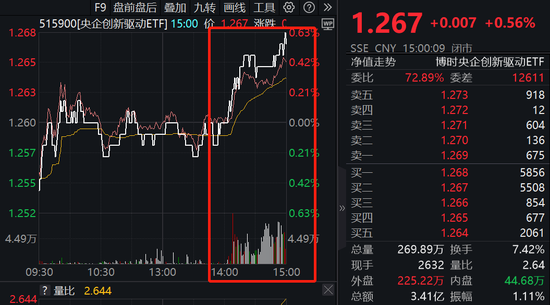 与南方央企科技ETF类似的是,博时央企创新驱动ETF同样是在下午开市期间出现成交额的快速放量。在12月12日尾盘的最后一个小时内,该基金成交额达2.77亿元,占全天成交额的近八成。截至当日收盘,该基金二级市场净值价格为每份额1.267元,收涨0.56%,全天换手率7.42%。