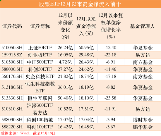 Wind数据显示,截至12月18日,华夏上证50ETF12月以来资金净流入超过60亿元,位居全市场榜首。易方达创业板ETF、南方中证500ETF紧随其后,资金净流入分别为29.48亿元、26.43亿元。