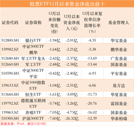 资金净流出方面,华泰柏瑞沪深300ETF12月以来资金净流出超过26亿元,国泰养殖ETF资金12月以来净流出4.73亿元,富国港股通互联网ETF、华夏恒生ETF资金净流出均超过3亿元,部分中证1000ETF及军工ETF资金净流出也较为居前。