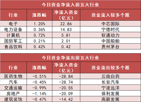 申万一级行业中,6个行业实现资金净流入,其中电子行业净流入22.86亿元居首。