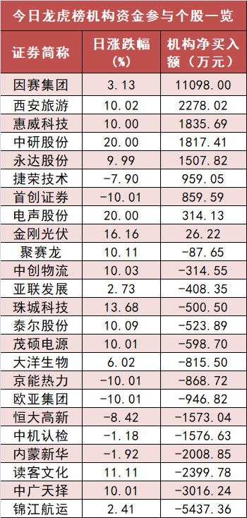盘后龙虎榜数据显示,机构现身24股,其中因赛集团等9股呈现机构资金净买入,锦江航运等13股呈现机构资金净卖出。