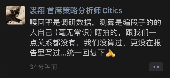 他表示,(研报中)赎回率是调研数据,所谓的测算是毫无常识的编段子,“我们没算过,更没在报告里写过。”