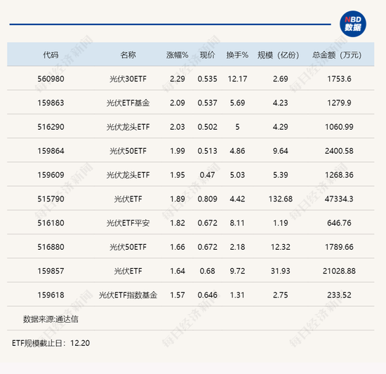 点评:今日上午,光伏30ETF(560980)表现最强,半日涨幅达到2.29%,该ETF规模为2.69亿份,其追踪的是中证光伏龙头30指数。