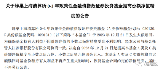 12月23日,蜂巢基金公告称,蜂巢上海清算所0-3年政策性金融债指数基金于2023年12月21日发生大额赎回,经与基金托管人协商一致,决定自2023年12月21日起提高基金A类及C类份额净值精度至小数点后八位,小数点后第九位四舍五入。