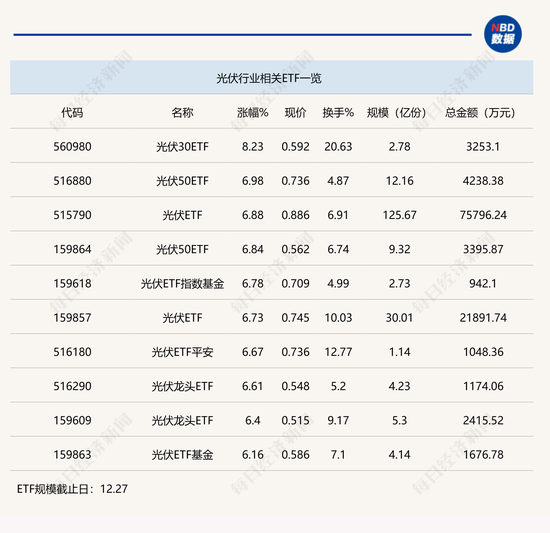 点评:光伏50ETF(516880)、光伏ETF(515790)、光伏50ETF(159864)等9只光伏行业ETF半日涨幅也均超过6%,其中,光伏ETF(515790)规模最大,达到125.67亿份,其半日成交7.58亿元,交易活跃。这些光伏ETF均追踪的是中证光伏产业指数。