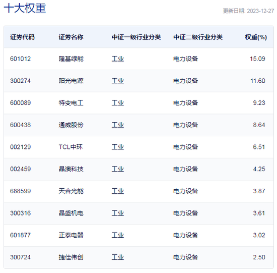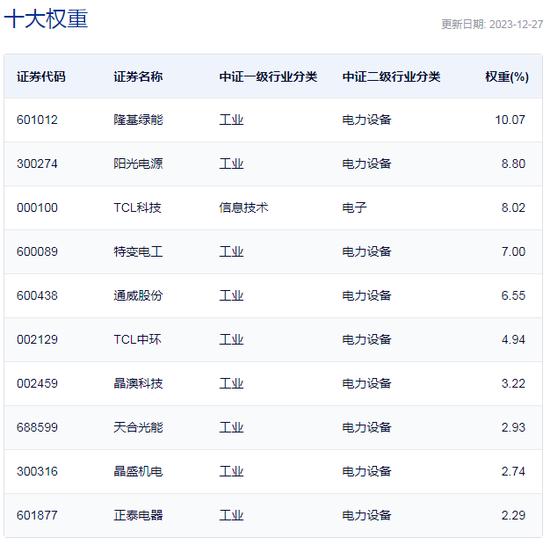 中证光伏产业指数发布于2019年4月22日,从沪深市场主营业务涉及光伏产业链上、中、下游的上市公司证券中,选取不超过50只最具代表性的上市公司证券作为指数样本,以反映沪深市场光伏产业上市公司证券的整体表现。