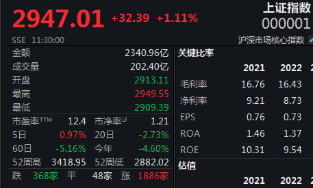 今日,A股放量大涨,市场情绪回暖,近4500股上涨,截至上午收盘,上证指数涨1.11%报2947.01点,深证成指涨2.34%报9406.42点,创业板指涨3.34%报1870.22点,科创50指数涨2.08%报847.36点,北证50涨2.72%。市场成交额5499.2亿元,较上日同期显著放大,北向资金实际净买入113.65亿元。