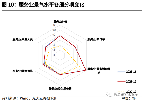 从细分项数据看,服务业需求指数与预期指数均小幅回升:从市场需求看,12月服务业新订单指数较上月上行0.1个百分点至47.0%,但连续8个月处于收缩区间;从市场预期看,12月服务业业务活动预期指数为59.4%,较上月上行0.1个百分点,多数服务业企业对未来行业发展仍较为乐观。