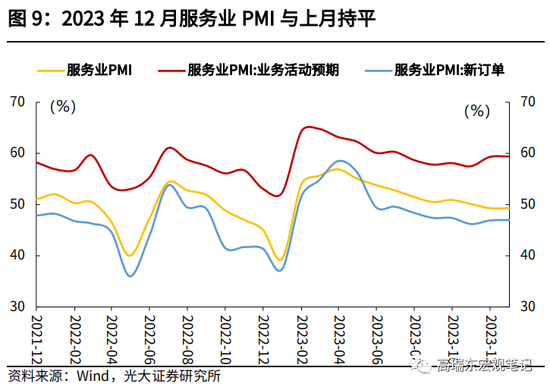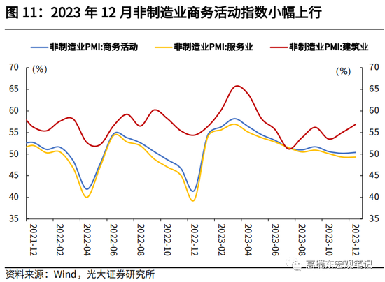 12月服务业商务活动指数为49.3%,与上月持平,服务业PMI自二季度以来下行趋势明显,23年11月首次降至荣枯线以下,12月服务业PMI止住下行趋势于低位企稳。从需求和预期看,12月服务业新订单指数环比上行0.1个百分点至47.0%,预期指数环比上行0.1个百分点至59.4%。从行业看,部分与出行消费相关的服务行业市场活跃度偏弱,金融业商务活动创出下半年以来新高。