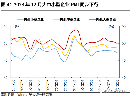 从结构上看,大中小型企业PMI同步下行,大型企业PMI较上月下行0.5个百分点至50.0%;中型企业PMI下行0.1个百分点至48.7%;小型企业PMI进一步下滑,下降0.5个百分点至47.3%,其中大型企业与小型企业PMI均已连续3个月下行。