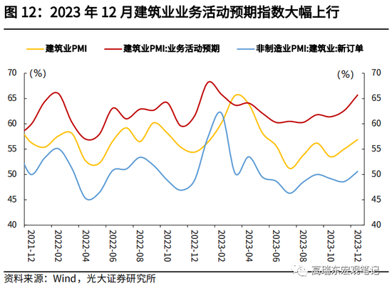 12月建筑业商务活动指数环比上行1.9个百分点至56.9%,连续2个月环比上升,创出自2023年6月以来的新高,部分企业在春节假期前加快施工进度,建筑业景气水平有所回升。分行业看,房屋建筑业和土木工程建筑业商务活动指数和新订单指数环比均有所上升,基础建设投资继续发力。从需求看,12月建筑业新订单指数环比上升2个百分点至50.6%;从市场预期看,建筑业业务活动预期指数环比上行3.1个百分点至65.7%,建筑业企业对市场发展信心较强。