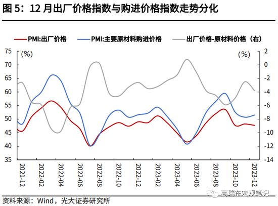 从价格结构来看,价格差方面,12月出厂价格-购进价格指数的差值有所扩大,由上月的-2.5个百分点扩大至-3.8个百分点;从企业规模来看,12月大、中、小型企业原材料购进价格指数分别为52.7%、50.9%和49.8%,出厂价格指数分别为49.0%、46.0%和47.2%。